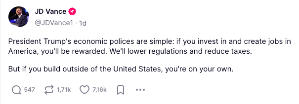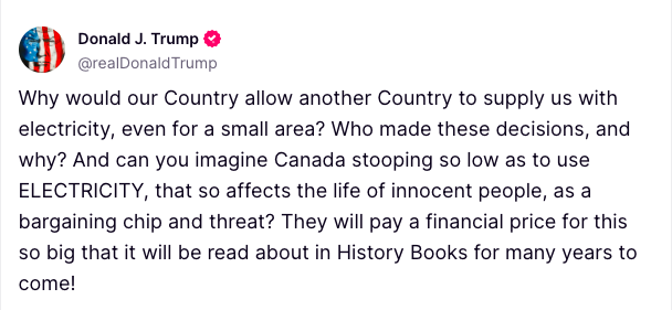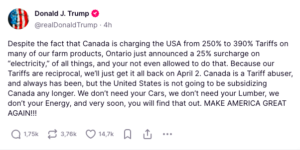Despite the fact that Cana­da is charg­ing the USA from 250% to 390% Tar­iffs on many of our farm prod­ucts, Ontario just announced a 25% sur­charge on “elec­tric­i­ty,” of all things, and your not even allowed to do that. Because our Tar­iffs are rec­i­p­ro­cal, we’ll just get it all back on April 2. Cana­da is a Tar­iff abuser, and always has been, but the Unit­ed States is not going to be sub­si­diz­ing Cana­da any longer. We don’t need your Cars, we don’t need your Lum­ber, we don’t your Ener­gy, and very soon, you will find that out. MAKE AMERICA GREAT AGAIN!!!