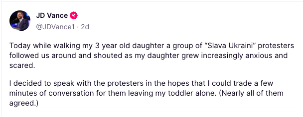 Today while walk­ing my 3 year old daugh­ter a group of “Sla­va Ukrai­ni” pro­test­ers fol­lowed us around and shout­ed as my daugh­ter grew increas­ing­ly anx­ious and scared.