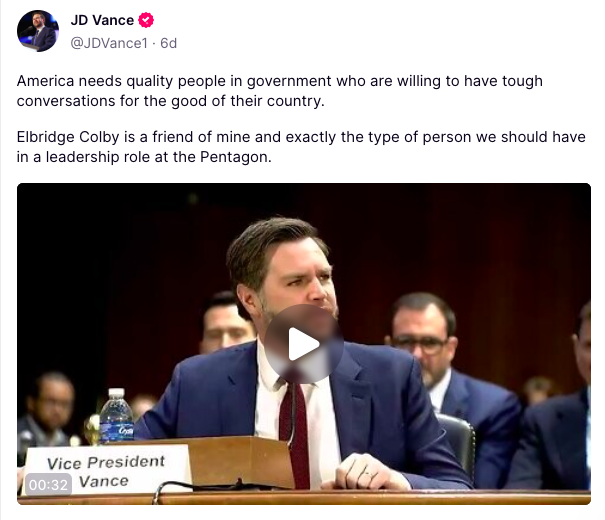 Elbridge Col­by is a friend of mine and exact­ly the type of per­son we should have in a lead­er­ship role at the Pen­ta­gon.