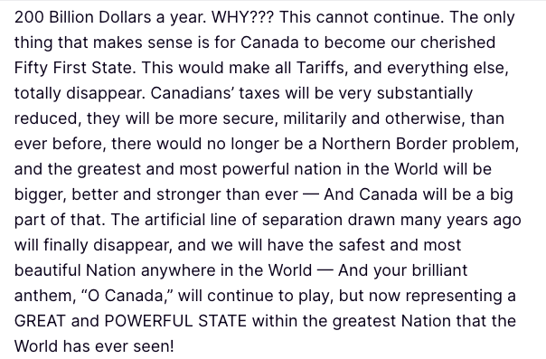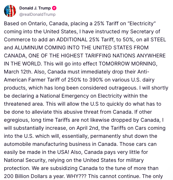 Based on Ontario, Cana­da, plac­ing a 25% Tar­iff on “Elec­tric­i­ty” com­ing into the Unit­ed States, I have instruct­ed my Sec­re­tary of Com­merce to add an ADDITIONAL 25% Tar­iff, to 50%, on all STEEL and ALUMINUM COMING INTO THE UNITED STATES FROM CANADA, ONE OF THE HIGHEST TARIFFING NATIONS ANYWHERE IN THE WORLD. This will go into effect TOMORROW MORNING, March 12th. Also, Cana­da must imme­di­ate­ly drop their Anti-Amer­i­can Farmer Tar­iff of 250% to 390% on var­i­ous U.S. dairy prod­ucts, which has long been con­sid­ered out­ra­geous. I will short­ly be declar­ing a Nation­al Emer­gency on Elec­tric­i­ty with­in the threat­ened area. This will allow the U.S to quick­ly do what has to be done to alle­vi­ate this abu­sive threat from Cana­da. If oth­er egre­gious, long time Tar­iffs are not like­wise dropped by Cana­da, I will sub­stan­tial­ly increase, on April 2nd, the Tar­iffs on Cars com­ing into the U.S. which will, essen­tial­ly, per­ma­nent­ly shut down the auto­mo­bile man­u­fac­tur­ing busi­ness in Cana­da. Those cars can eas­i­ly be made in the USA! Also, Cana­da pays very lit­tle for Nation­al Secu­ri­ty, rely­ing on the Unit­ed States for mil­i­tary pro­tec­tion. We are sub­si­diz­ing Cana­da to the tune of more than 200 Bil­lion Dol­lars a year. WHY??? This can­not con­tin­ue. The only thing that makes sense is for Cana­da to become our cher­ished Fifty First State. This would make all Tar­iffs, and every­thing else, total­ly dis­ap­pear. Cana­di­ans’ tax­es will be very sub­stan­tial­ly reduced, they will be more secure, mil­i­tar­i­ly and oth­er­wise, than ever before, there would no longer be a North­ern Bor­der prob­lem, and the great­est and most pow­er­ful nation in the World will be big­ger, bet­ter and stronger than ever — And Cana­da will be a big part of that. The arti­fi­cial line of sep­a­ra­tion drawn many years ago will final­ly dis­ap­pear, and we will have the safest and most beau­ti­ful Nation any­where in the World — And your bril­liant anthem, “O Cana­da,” will con­tin­ue to play, but now rep­re­sent­ing a GREAT and POWERFUL STATE with­in the great­est Nation that the World has ever seen!