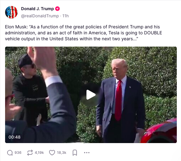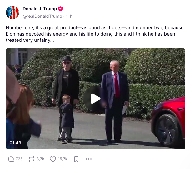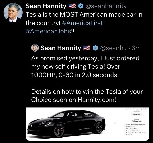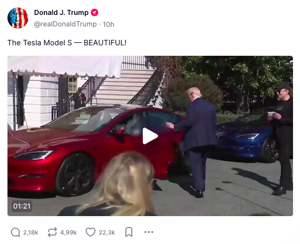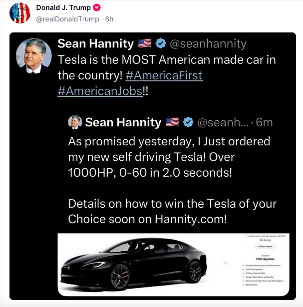 To Repub­li­cans, Con­ser­v­a­tives, and all great Amer­i­cans, Elon Musk is “putting it on the line” in order to help our Nation, and he is doing a FANTASTIC JOB! But the Rad­i­cal Left Lunatics, as they often do, are try­ing to ille­gal­ly and col­lu­sive­ly boy­cott Tes­la, one of the World’s great automak­ers, and Elon’s “baby,” in order to attack and do harm to Elon, and every­thing he stands for. They tried to do it to me at the 2024 Pres­i­den­tial Bal­lot Box, but how did that work out? In any event, I’m going to buy a brand new Tes­la tomor­row morn­ing as a show of con­fi­dence and sup­port for Elon Musk, a tru­ly great Amer­i­can. Why should he be pun­ished for putting his tremen­dous skills to work in order to help MAKE AMERICA GREAT AGAIN???
