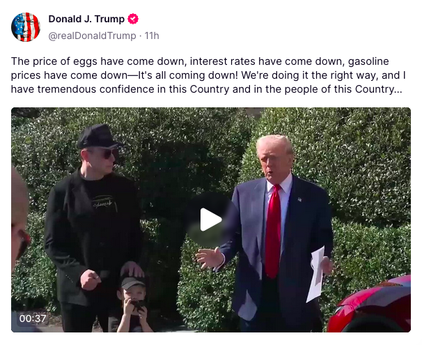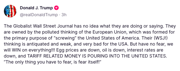 The Glob­al­ist Wall Street Jour­nal has no idea what they are doing or say­ing. They are owned by the pol­lut­ed think­ing of the Euro­pean Union, which was formed for the pri­ma­ry pur­pose of “screw­ing” the Unit­ed States of Amer­i­ca. Their (WSJ!) think­ing is anti­quat­ed and weak, and very bad for the USA. But have no fear, we will WIN on every­thing!!! Egg prices are down, oil is down, inter­est rates are down, and TARIFF RELATED MONEY IS POURING INTO THE UNITED STATES. “The only thing you have to fear, is fear itself!”