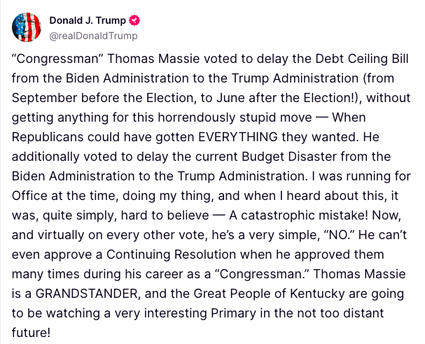 Con­gress­man” Thomas Massie vot­ed to delay the Debt Ceil­ing Bill from the Biden Admin­is­tra­tion to the Trump Admin­is­tra­tion (from Sep­tem­ber before the Elec­tion, to June after the Elec­tion!), with­out get­ting any­thing for this hor­ren­dous­ly stu­pid move — When Repub­li­cans could have got­ten EVERYTHING they want­ed. He addi­tion­al­ly vot­ed to delay the cur­rent Bud­get Dis­as­ter from the Biden Admin­is­tra­tion to the Trump Admin­is­tra­tion. I was run­ning for Office at the time, doing my thing, and when I heard about this, it was, quite sim­ply, hard to believe — A cat­a­stroph­ic mis­take! Now, and vir­tu­al­ly on every oth­er vote, he’s a very sim­ple, “NO.” He can’t even approve a Con­tin­u­ing Res­o­lu­tion when he approved them many times dur­ing his career as a “Con­gress­man.” Thomas Massie is a GRANDSTANDER, and the Great Peo­ple of Ken­tucky are going to be watch­ing a very inter­est­ing Pri­ma­ry in the not too dis­tant future!