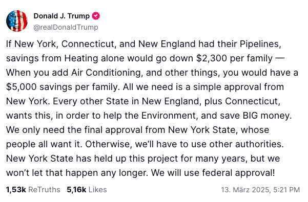 Wenn New York, Con­necti­cut und Neueng­land ihre Pipelines hät­ten, wür­den die Einsparun­gen allein bei der Heizung um 2.300 Dol­lar pro Fam­i­lie sinken — wenn man die Kli­maan­lage und andere Dinge hinzurech­net, käme man auf eine Einsparung von 5.000 Dol­lar pro Fam­i­lie. Alles, was wir brauchen, ist eine ein­fache Genehmi­gung von New York. Alle anderen Bun­desstaat­en in Neueng­land sowie Con­necti­cut wollen dies, um der Umwelt zu helfen und viel Geld zu sparen. Wir brauchen nur noch die endgültige Zus­tim­mung des Staates New York, dessen Bürg­er dies alle wollen. Anson­sten müssen wir auf andere Behör­den zurück­greifen. Der Staat New York hat dieses Pro­jekt viele Jahre lang aufge­hal­ten, aber das wer­den wir nicht länger hin­nehmen. Wir wer­den die Bun­des­genehmi­gung nutzen!