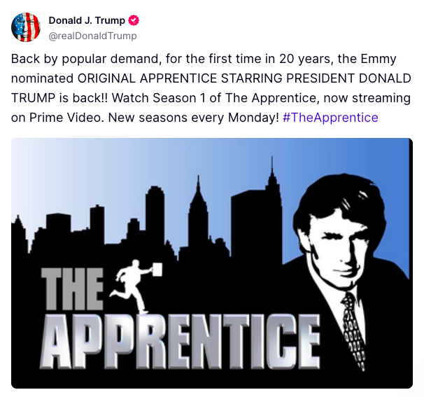 Back by pop­u­lar demand, for the first time in 20 years, the Emmy nom­i­nat­ed ORIGINAL APPRENTICE STARRING PRESIDENT DONALD TRUMP is back!! Watch Sea­son 1 of The Appren­tice, now stream­ing on Prime Video. New sea­sons every Mon­day! #TheAp­pren­tice