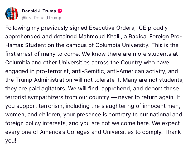 Fol­low­ing my pre­vi­ous­ly signed Exec­u­tive Orders, ICE proud­ly appre­hend­ed and detained Mah­moud Khalil, a Rad­i­cal For­eign Pro-Hamas Stu­dent on the cam­pus of Colum­bia Uni­ver­si­ty. This is the first arrest of many to come. We know there are more stu­dents at Colum­bia and oth­er Uni­ver­si­ties across the Coun­try who have engaged in pro-ter­ror­ist, anti-Semit­ic, anti-Amer­i­can activ­i­ty, and the Trump Admin­is­tra­tion will not tol­er­ate it. Many are not stu­dents, they are paid agi­ta­tors. We will find, appre­hend, and deport these ter­ror­ist sym­pa­thiz­ers from our coun­try — nev­er to return again. If you sup­port ter­ror­ism, includ­ing the slaugh­ter­ing of inno­cent men, women, and chil­dren, your pres­ence is con­trary to our nation­al and for­eign pol­i­cy inter­ests, and you are not wel­come here. We expect every one of America’s Col­leges and Uni­ver­si­ties to com­ply. Thank you!