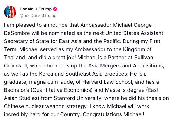 I am pleased to announce that Ambas­sador Michael George DeS­om­bre will be nom­i­nat­ed as the next Unit­ed States Assis­tant Sec­re­tary of State for East Asia and the Pacif­ic. Dur­ing my First Term, Michael served as my Ambas­sador to the King­dom of Thai­land, and did a great job! Michael is a Part­ner at Sul­li­van Cromwell, where he heads up the Asia Merg­ers and Acqui­si­tions, as well as the Korea and South­east Asia prac­tices. He is a grad­u­ate, magna cum laude, of Har­vard Law School, and has a Bachelor’s (Quan­ti­ta­tive Eco­nom­ics) and Master’s degree (East Asian Stud­ies) from Stan­ford Uni­ver­si­ty, where he did his the­sis on Chi­nese nuclear weapon strat­e­gy. I know Michael will work incred­i­bly hard for our Coun­try. Con­grat­u­la­tions Michael!