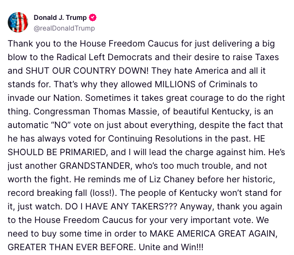 Thank you to the House Free­dom Cau­cus for just deliv­er­ing a big blow to the Rad­i­cal Left Democ­rats and their desire to raise Tax­es and SHUT OUR COUNTRY DOWN! They hate Amer­i­ca and all it stands for. That’s why they allowed MILLIONS of Crim­i­nals to invade our Nation. Some­times it takes great courage to do the right thing. Con­gress­man Thomas Massie, of beau­ti­ful Ken­tucky, is an auto­mat­ic “NO” vote on just about every­thing, despite the fact that he has always vot­ed for Con­tin­u­ing Res­o­lu­tions in the past. HE SHOULD BE PRIMARIED, and I will lead the charge against him. He’s just anoth­er GRANDSTANDER, who’s too much trou­ble, and not worth the fight. He reminds me of Liz Chaney before her his­toric, record break­ing fall (loss!). The peo­ple of Ken­tucky won’t stand for it, just watch. DO I HAVE ANY TAKERS??? Any­way, thank you again to the House Free­dom Cau­cus for your very impor­tant vote. We need to buy some time in order to MAKE AMERICA GREAT AGAIN, GREATER THAN EVER BEFORE. Unite and Win!!!